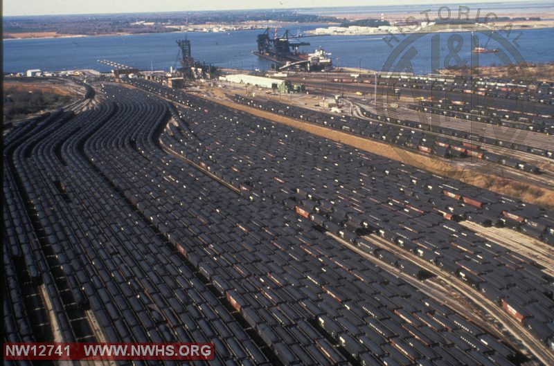 Como muestra de la importancia de éste tráfico, un par de vistas aéreas de las playas de vías de Lamberts Point, en el puerto de Norfolk, con los embarcaderos al fondo, donde esperaban las composiciones de carboneros.