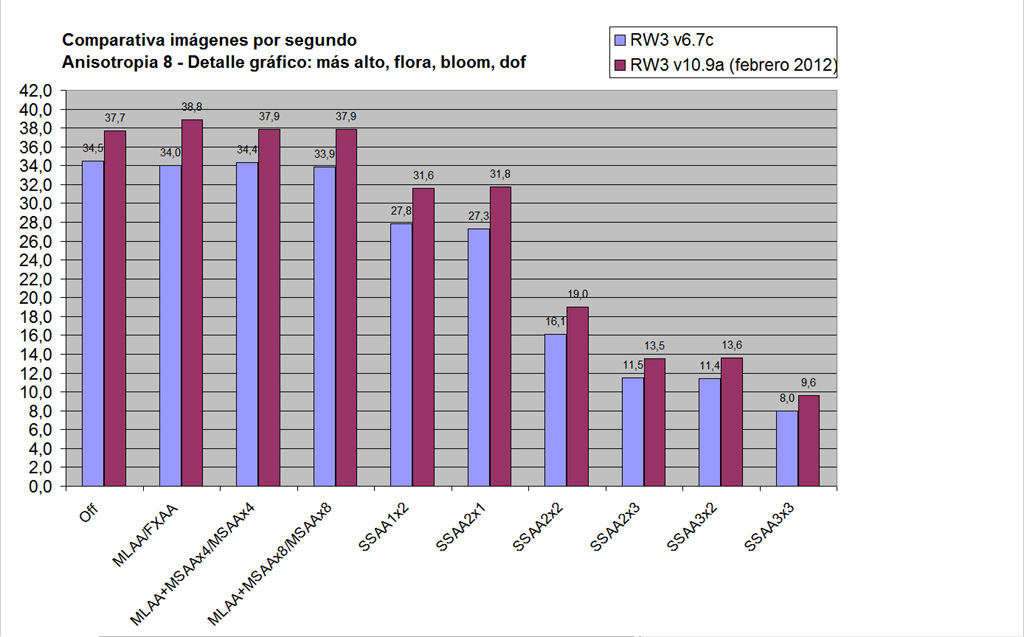 Lo que sí me animo a comentar es el efecto del antialiasing en el rendimiento, según ajustes de antialiasing que propongo que cada uno busque en su máquina: