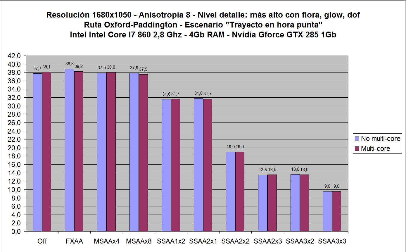 En referencia al multi-core, por ahora no encuentro ningún efecto en el rendimiento en fps. Siguiendo con el test propuesto: