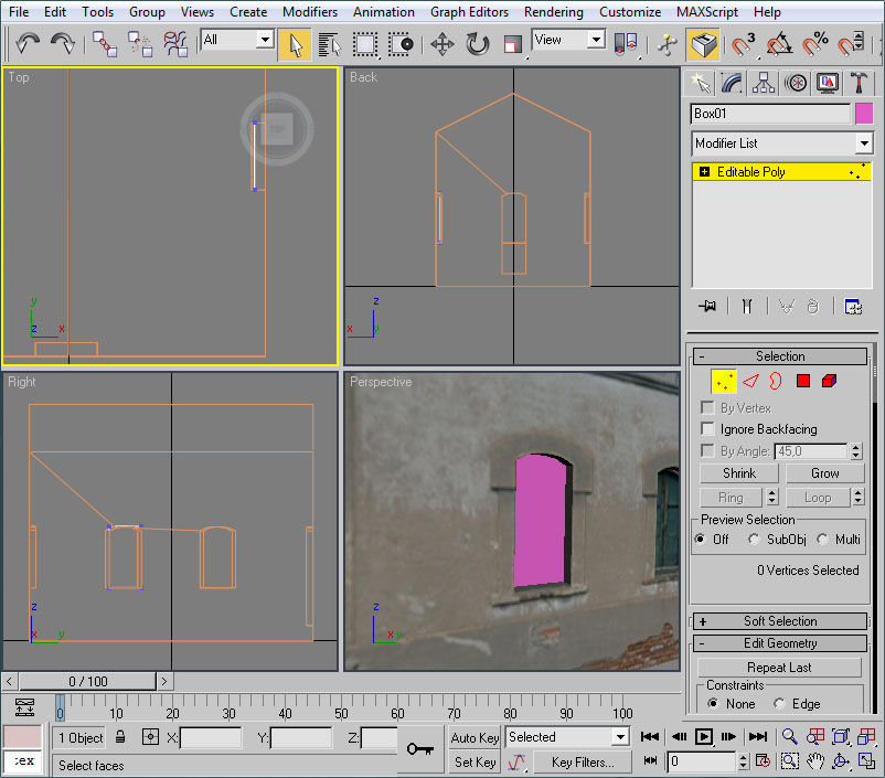 Para proceder a borrarlos. Con esto habremos eliminado todas las caras del cubo menos la que se orienta hacia el exterior de la ventana.