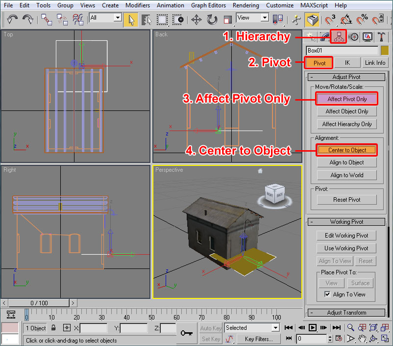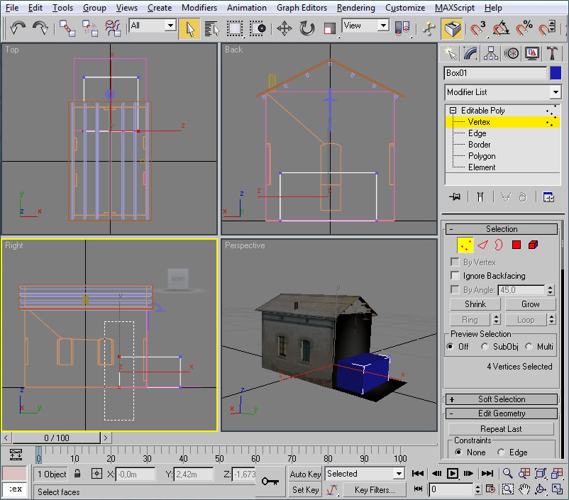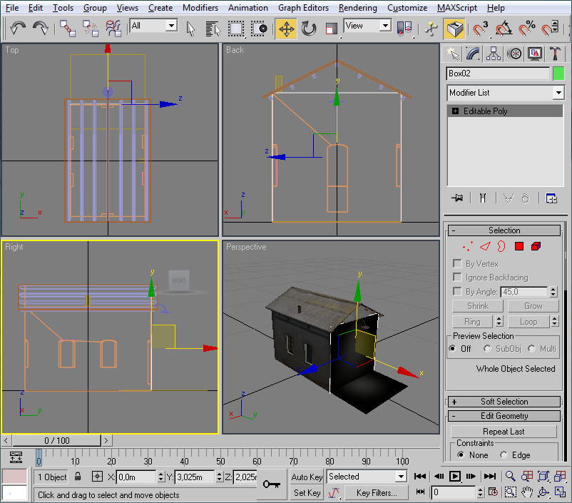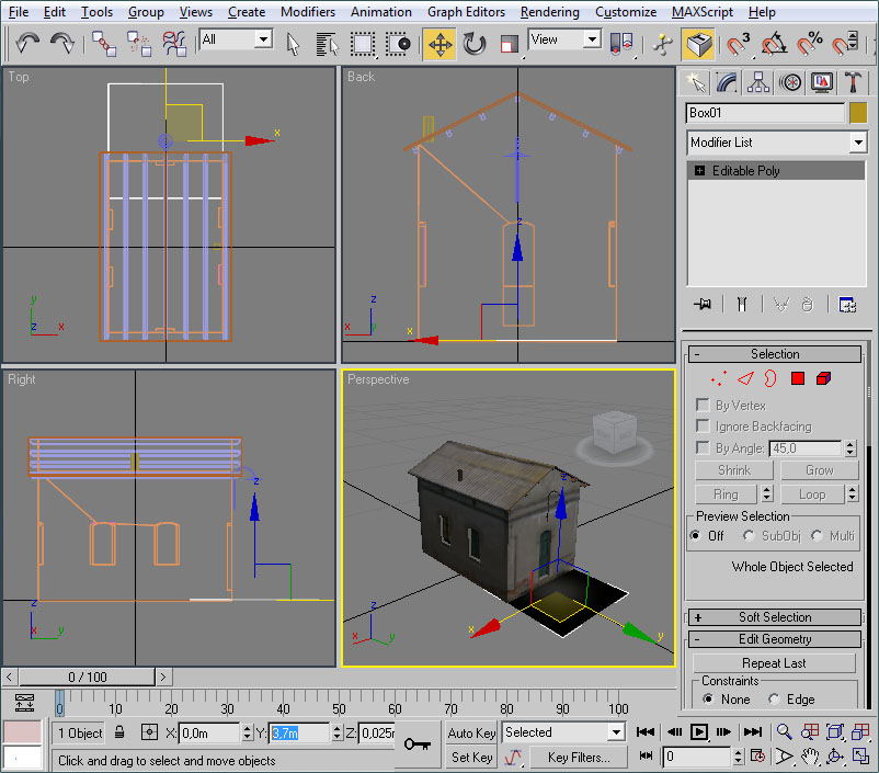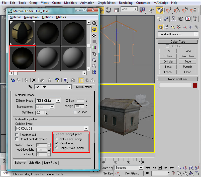 Ahora iremos al 3ds para crear un polígono sobre la ventana que deseemos que esté iluminada por la noche. Dejaremos visible tan sólo el cuerpo de la casilla "cercano" 1_0256_Casilla, y sobre el Viewport Right crearemos un cubo de las dimensiones aproximadas de la ventana a cubrir, y le daremos suficiente longitud para que, partiendo del eje central de la casilla, llegue a cubrir la cara de la ventana: