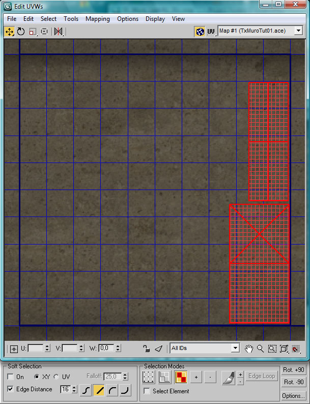 - Creamos con el ratón una selección que incluya los vértices superiores del muro (son los que quedan a la derecha de los mapeos una vez girados).