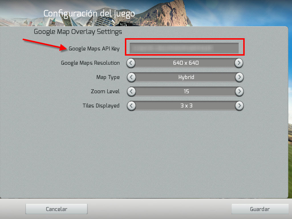 El primer campo superior es para introducir la Google Maps API Key. Haz clic en este campo de texto y presiona CTRL + V para pegar la clave en él.