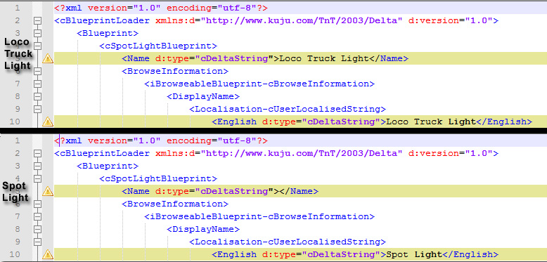 Pero en la línea 67 aparece una primera diferencia: la luz "Loco Truck Light" tiene el parámetro "Cast Shadows" (generar sombras) que la "Spot Light" no tiene.